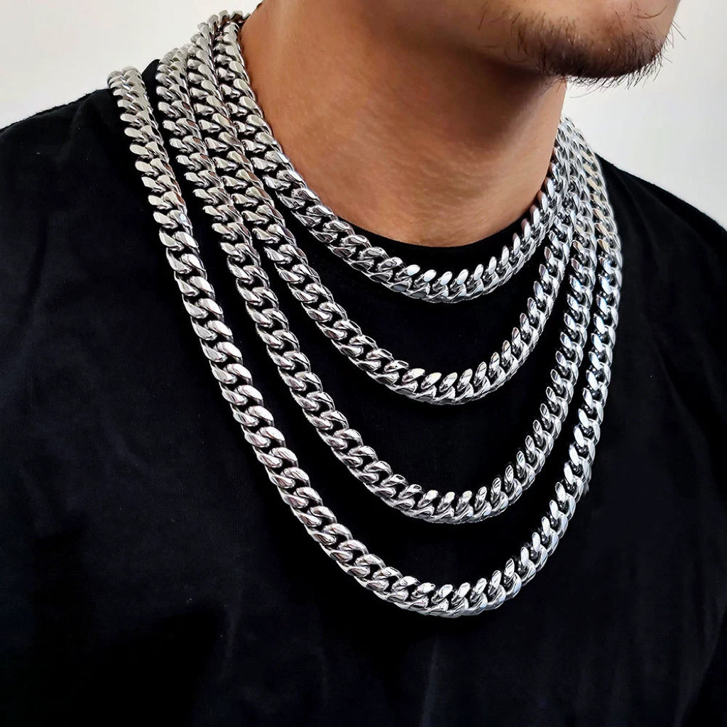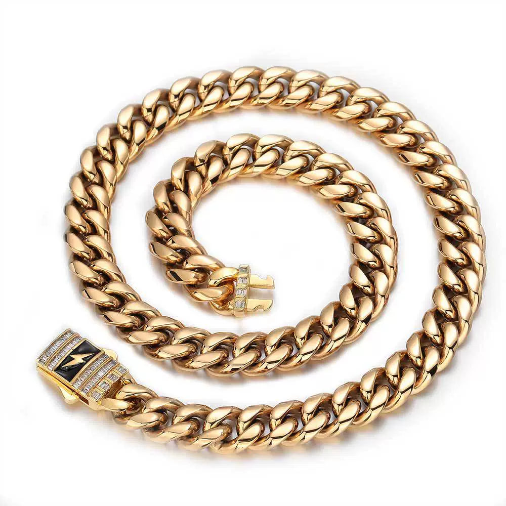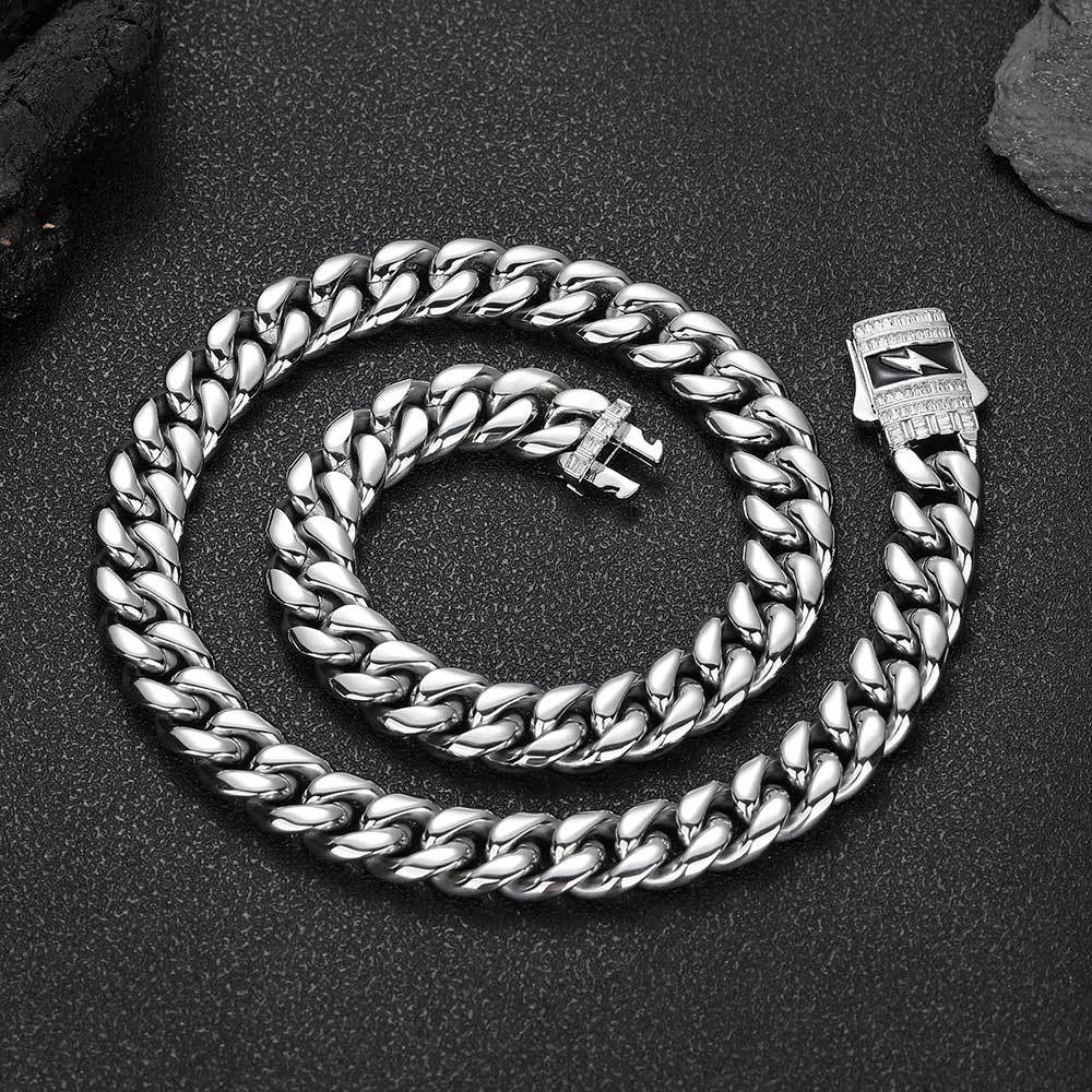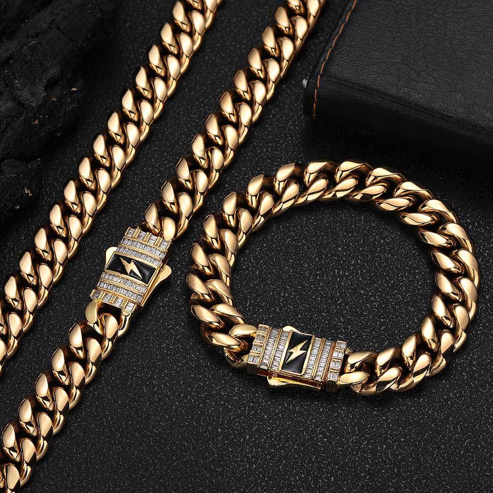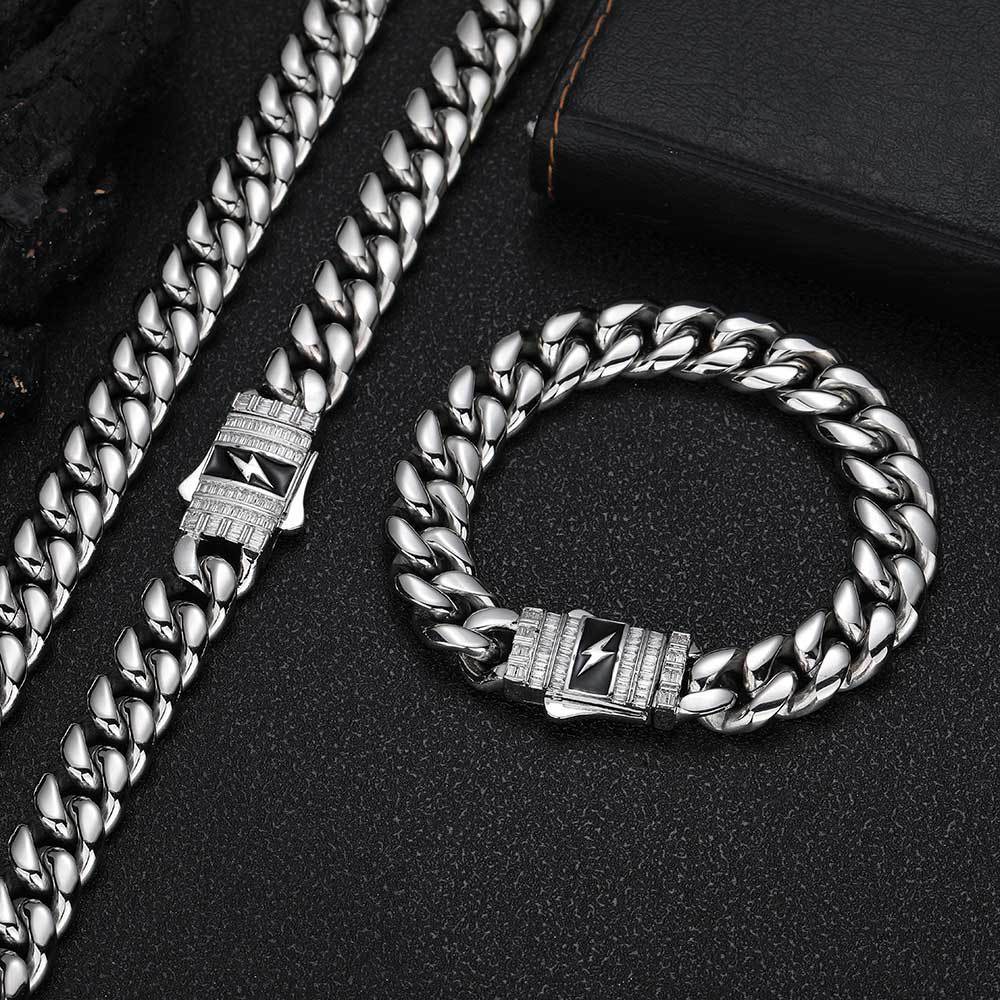 Wholesale 12mm HipHop Lightning Cubic Zirconia Spring Clasp 304 Stainless Steel Cuban Bracelet and Necklace, Chain 7in-30in, Waterproof