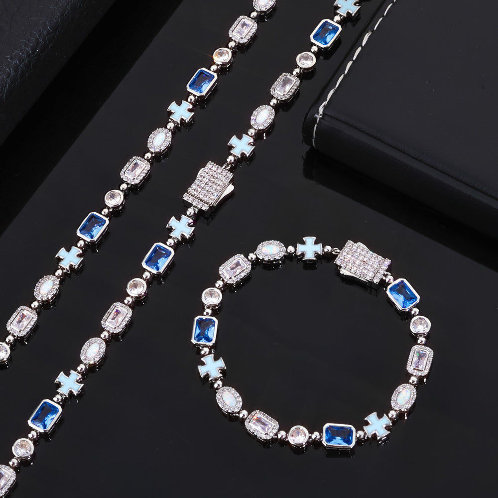 Wholesale 6mm Blue Gem Opal Drip Cross Cubic Zirconia Hip Hop Necklace and Bracelets,7in-24in