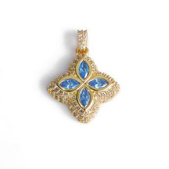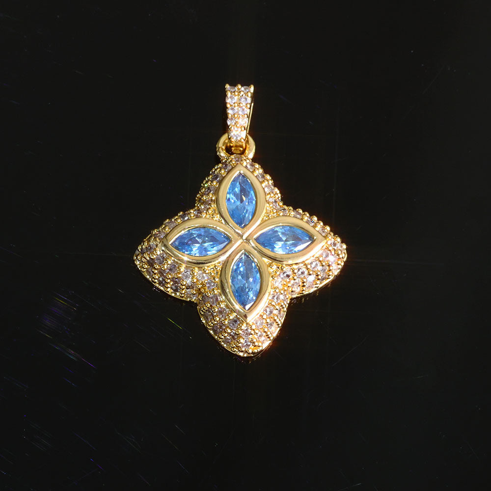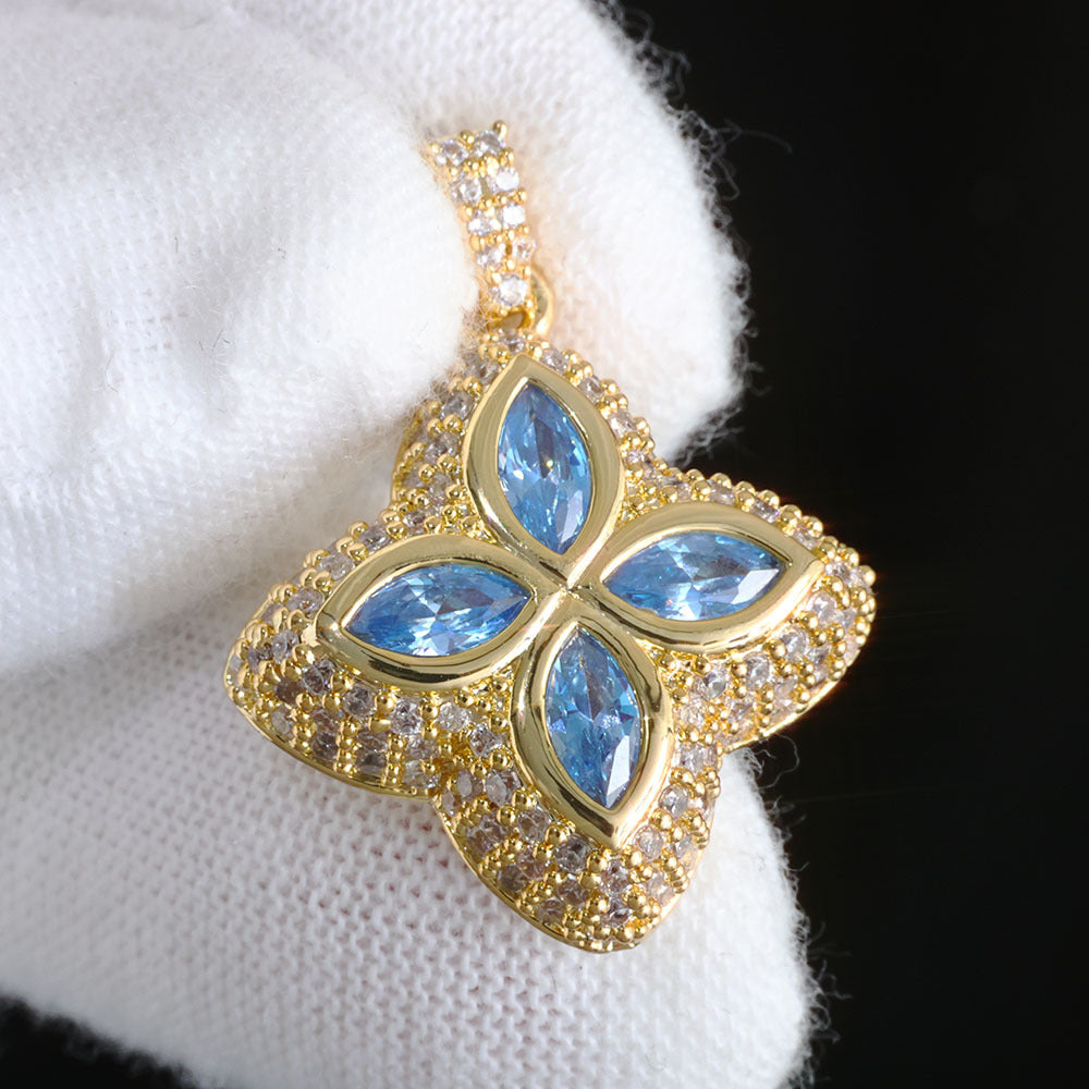 Wholesale Colorful Four Leaf Clover Cubic Zirconia Hip Hop Pendant Necklace, Chain 18in*5mm Gold&Blue zircon / 5mm*18in