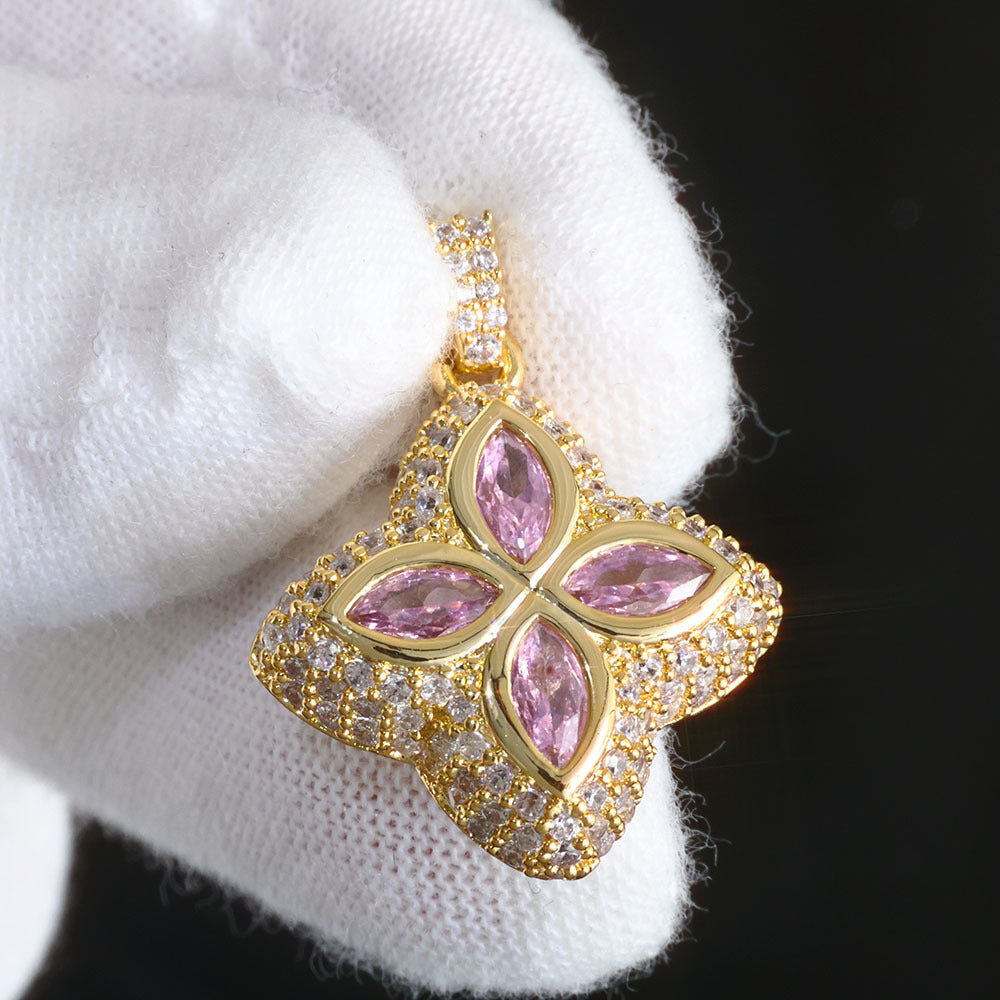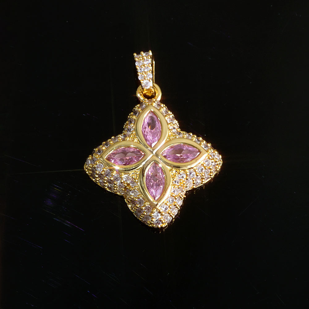 Wholesale Colorful Four Leaf Clover Cubic Zirconia Hip Hop Pendant Necklace, Chain 18in*5mm Gold&Pink zircon / 5mm*18in