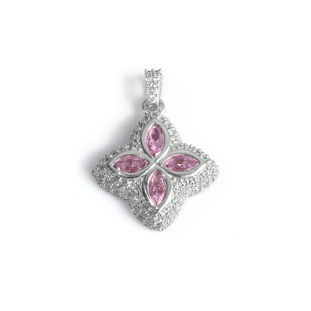 Wholesale Colorful Four Leaf Clover Cubic Zirconia Hip Hop Pendant Necklace, Chain 18in*5mm Silver&Pink zircon / 5mm*18in
