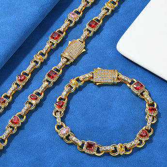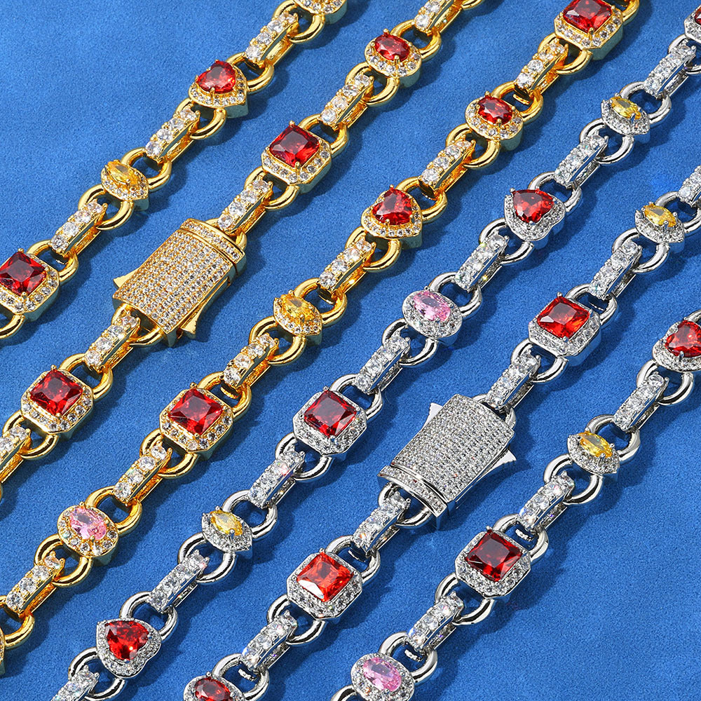 Wholesale Colorful Gemstone Cubic Zirconia Hip Hop Necklace and Bracelet, Chain 7in-24in