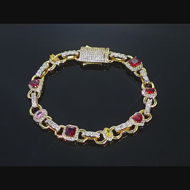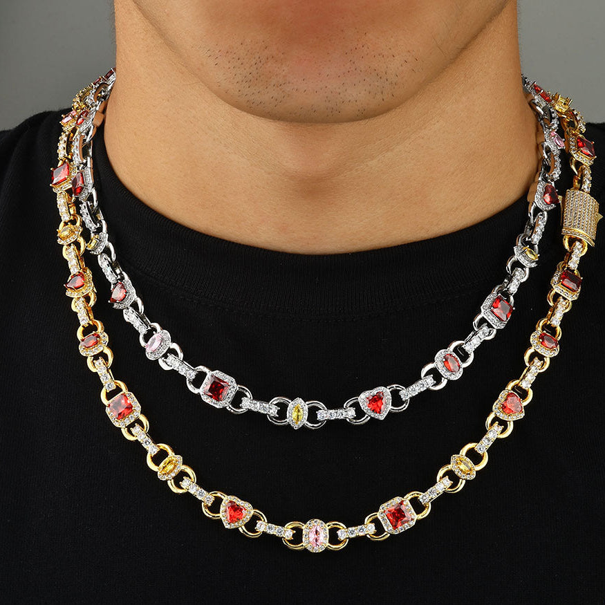 Add a vibrant twist to your hip hop jewelry lineup with this Colorful Gemstone Cuban Chain, a perfect blend of luxury and street fashion. Each link is meticulously set with multi-color CZ stones, offering a brilliant spectrum of shine that catches every eye. The bold and stylish design makes it a standout accessory for those who love to express individuality through color and attitude.