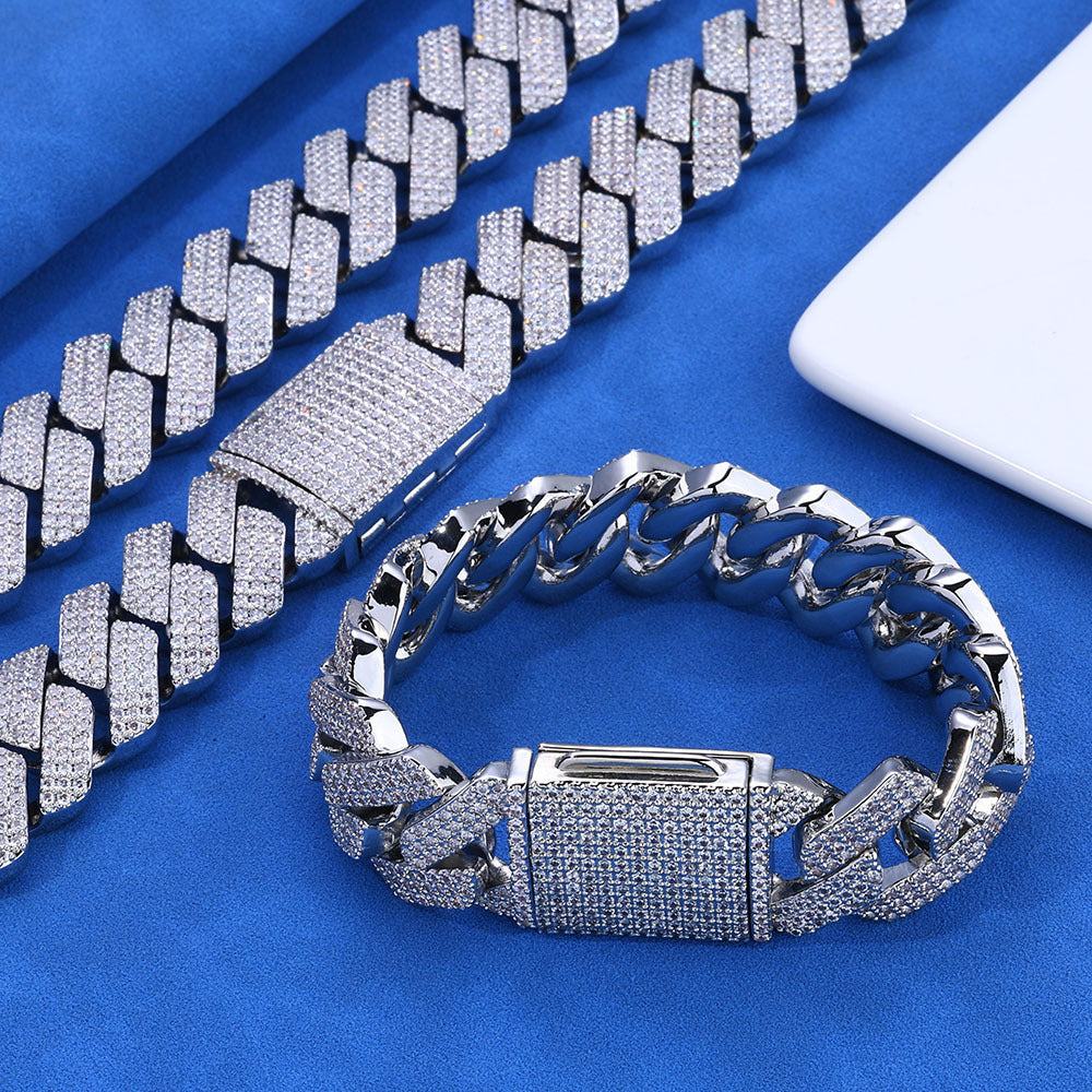 Wholesale Cuban Chain Diamond-shaped Jewelry Set HipHop Bracelet and Necklace, Chain 7in-24in