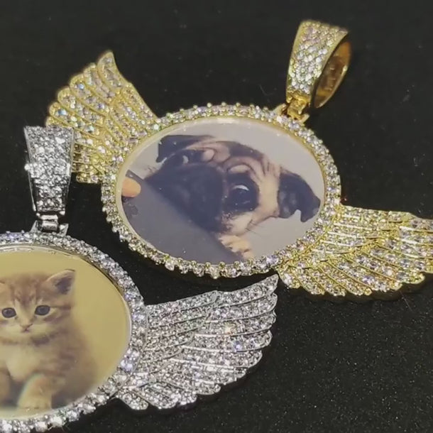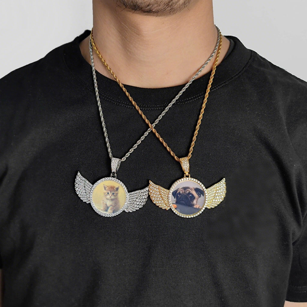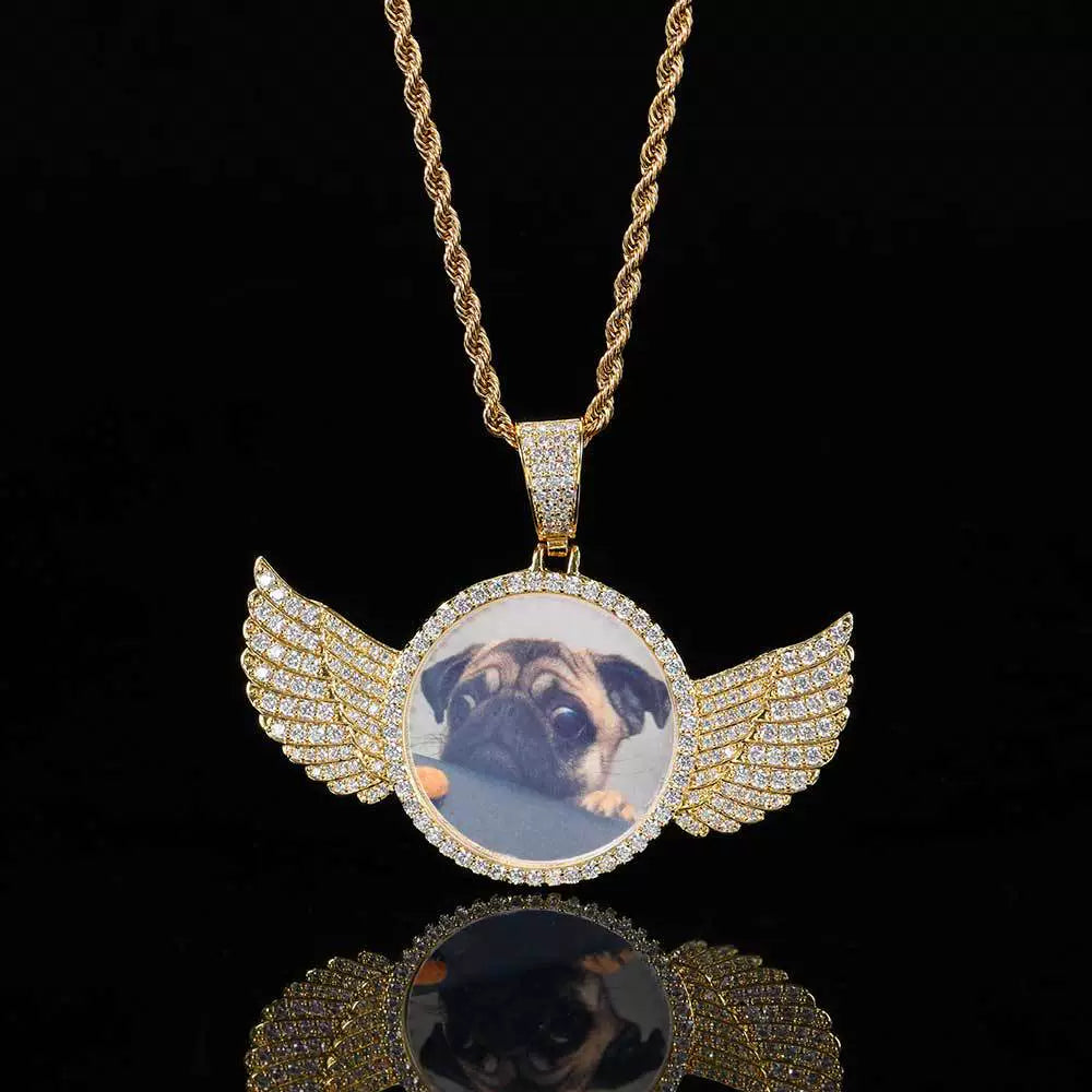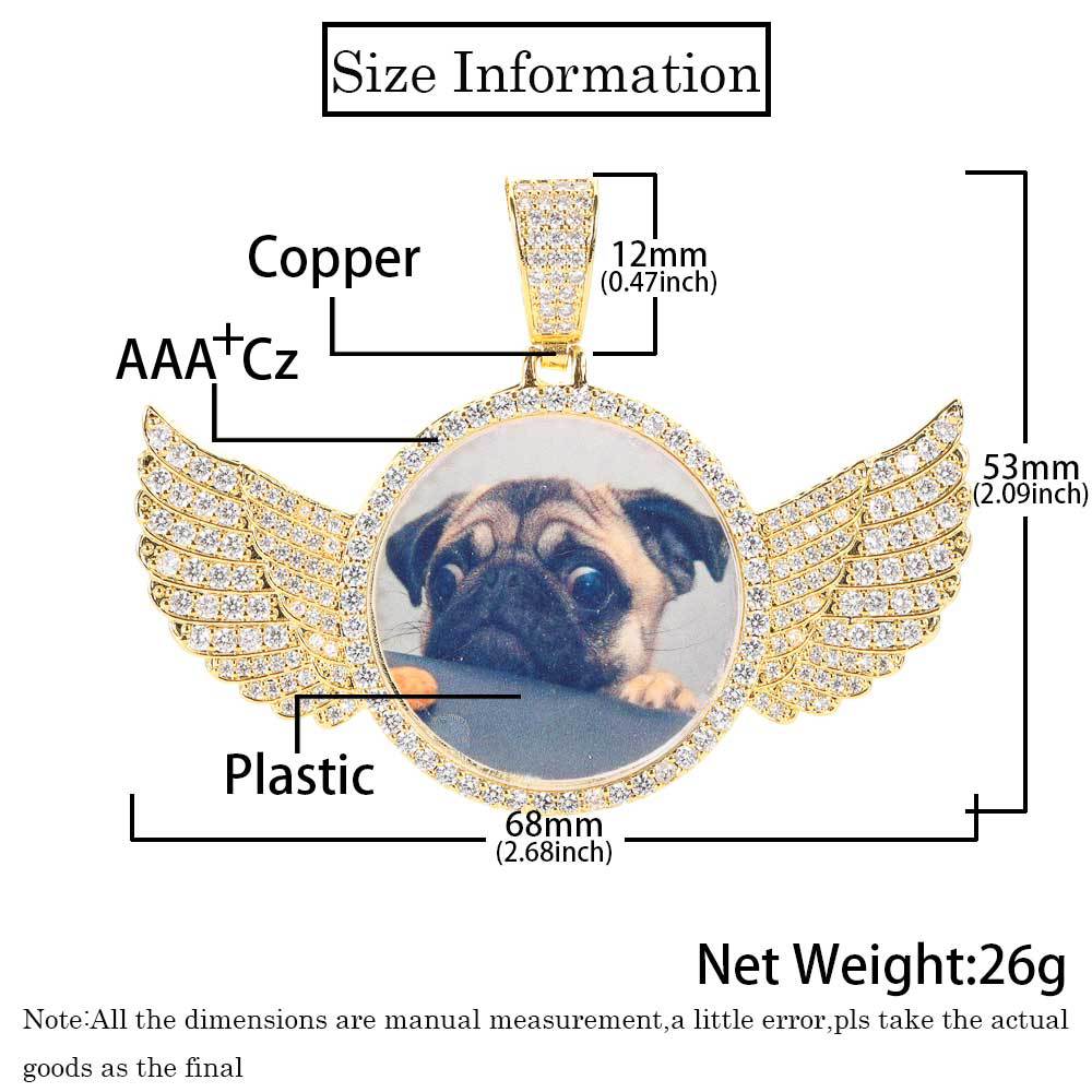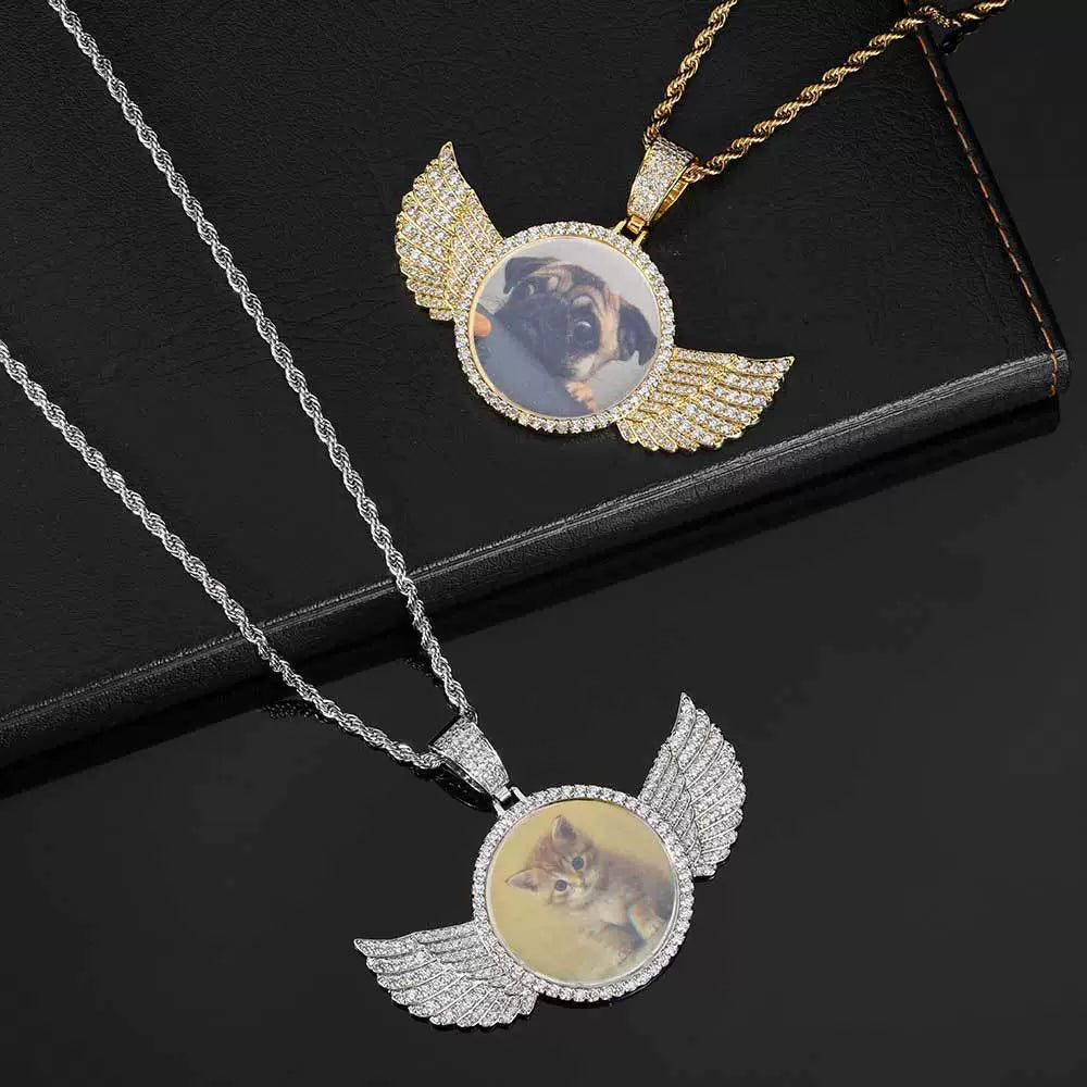 Wholesale Cubic Zircon Angel Wing Round DIY Photo Hip Hop Pendant Necklace,Chain 24in