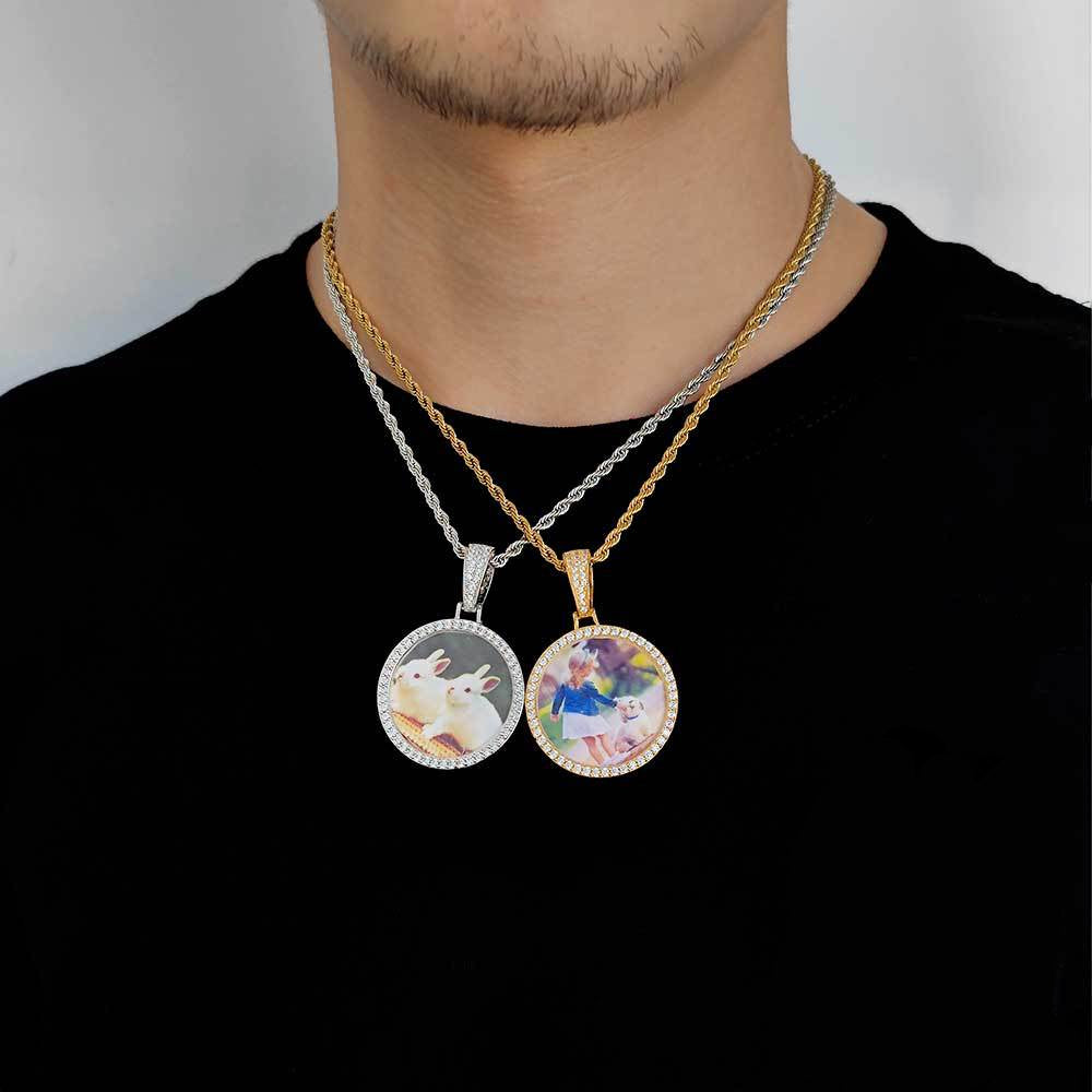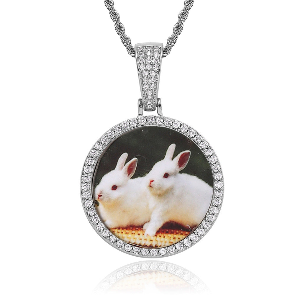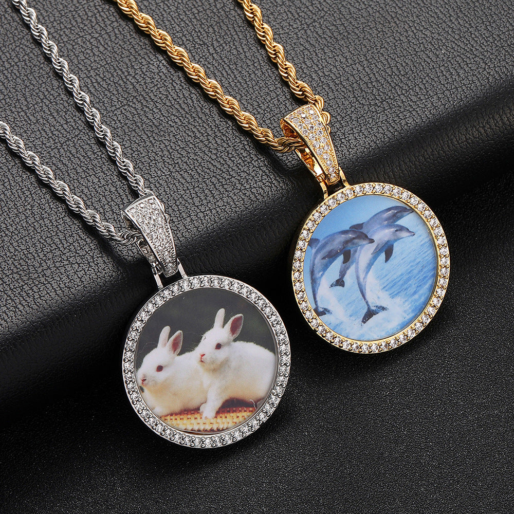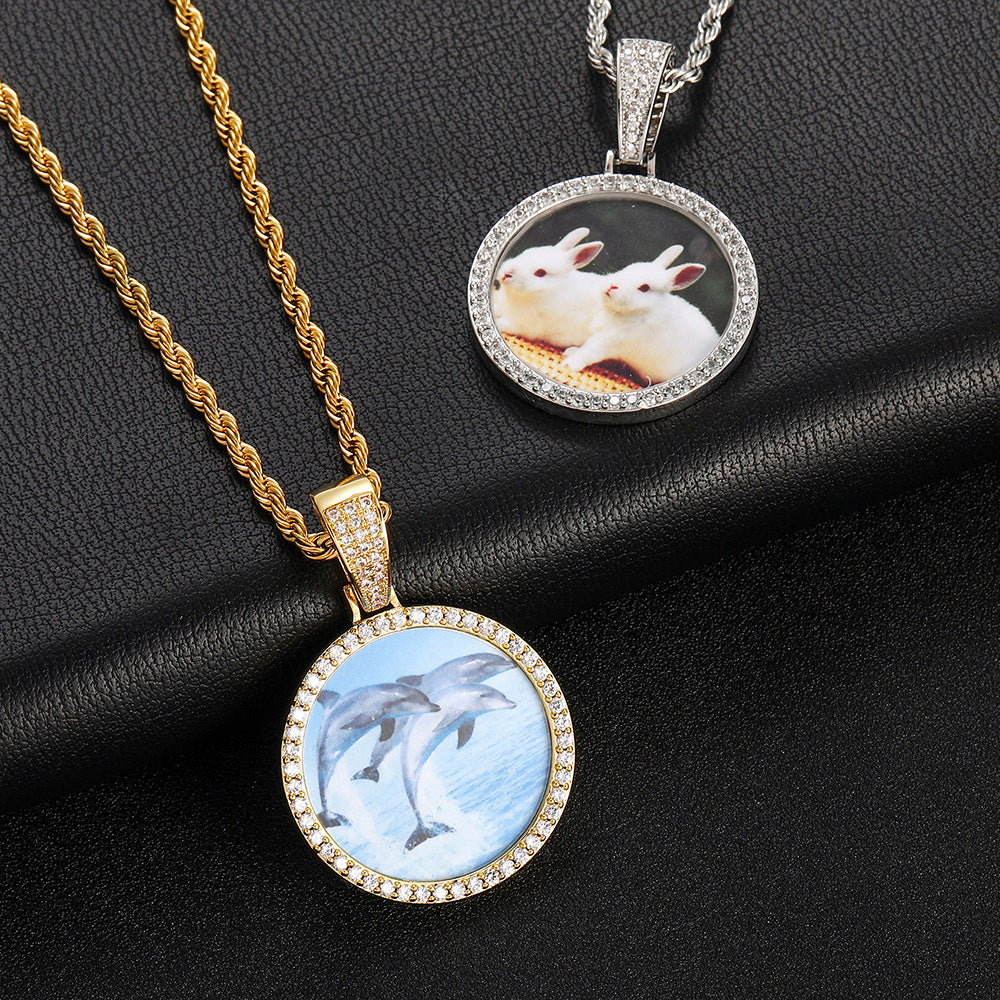 Wholesale Cubic Zircon Hip Hop Round DIY Photo Pendant Necklace, Chain 24in