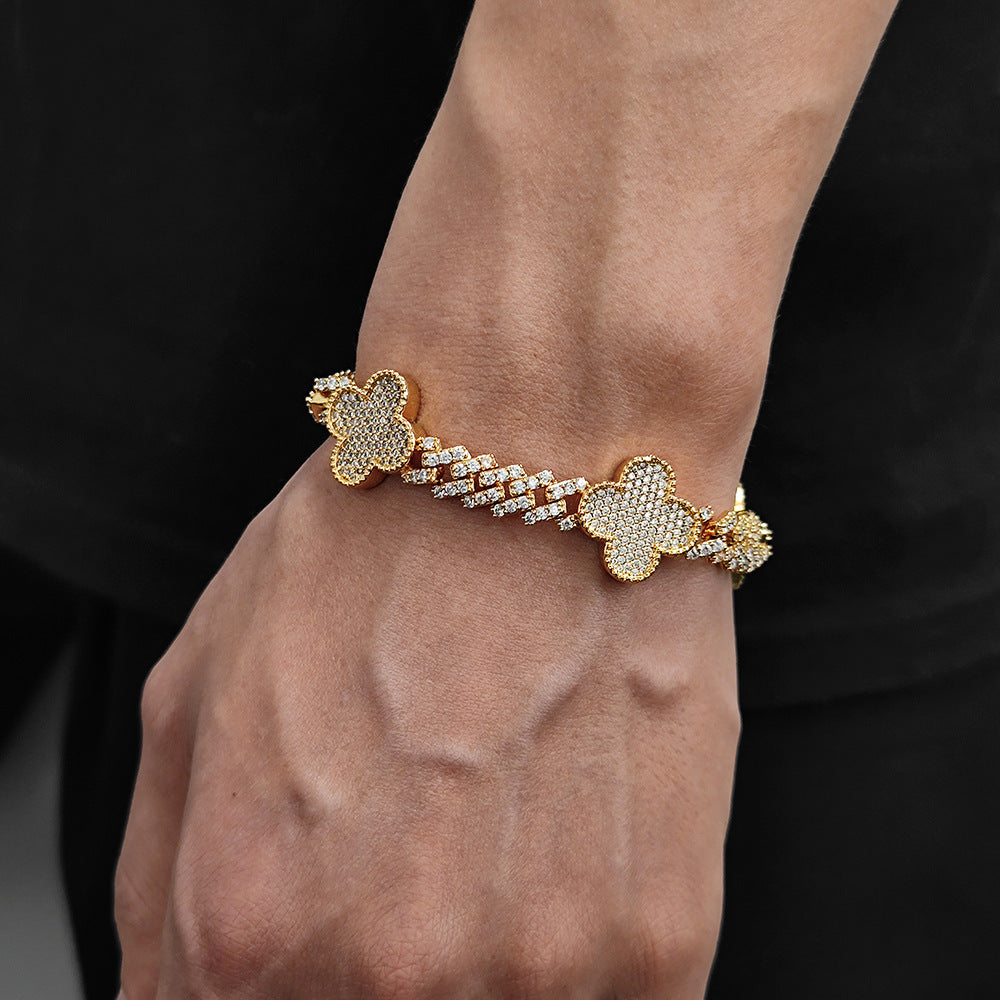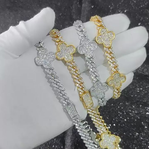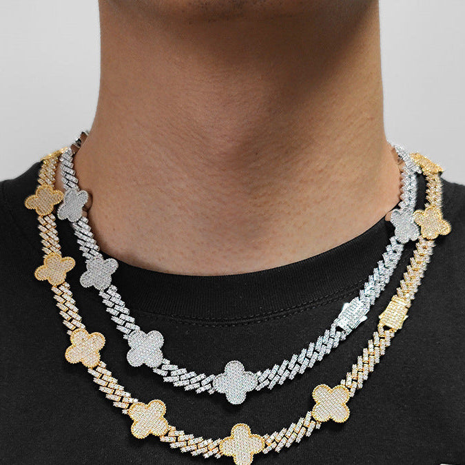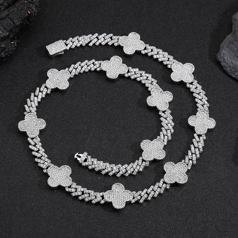 Wholesale Four-Leaf Clover Cubic Zirconia Jewelry Set HipHop Cuban Bracelet and Necklace, Chain 7in-24in