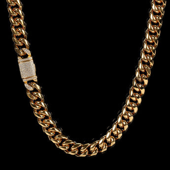 Elevate your jewelry collection with this 12mm Stainless Steel Cuban Link Chain Necklace — sleek, durable, and unisex. The chain features a rounded and polished Cuban design, offering a dense, refined texture with a strong hip hop edge. Made from premium stainless steel, this piece is both solid and comfortable to wear, while the 18K vacuum gold plating provides a lasting shine and superior resistance to tarnish, fading, or rust.