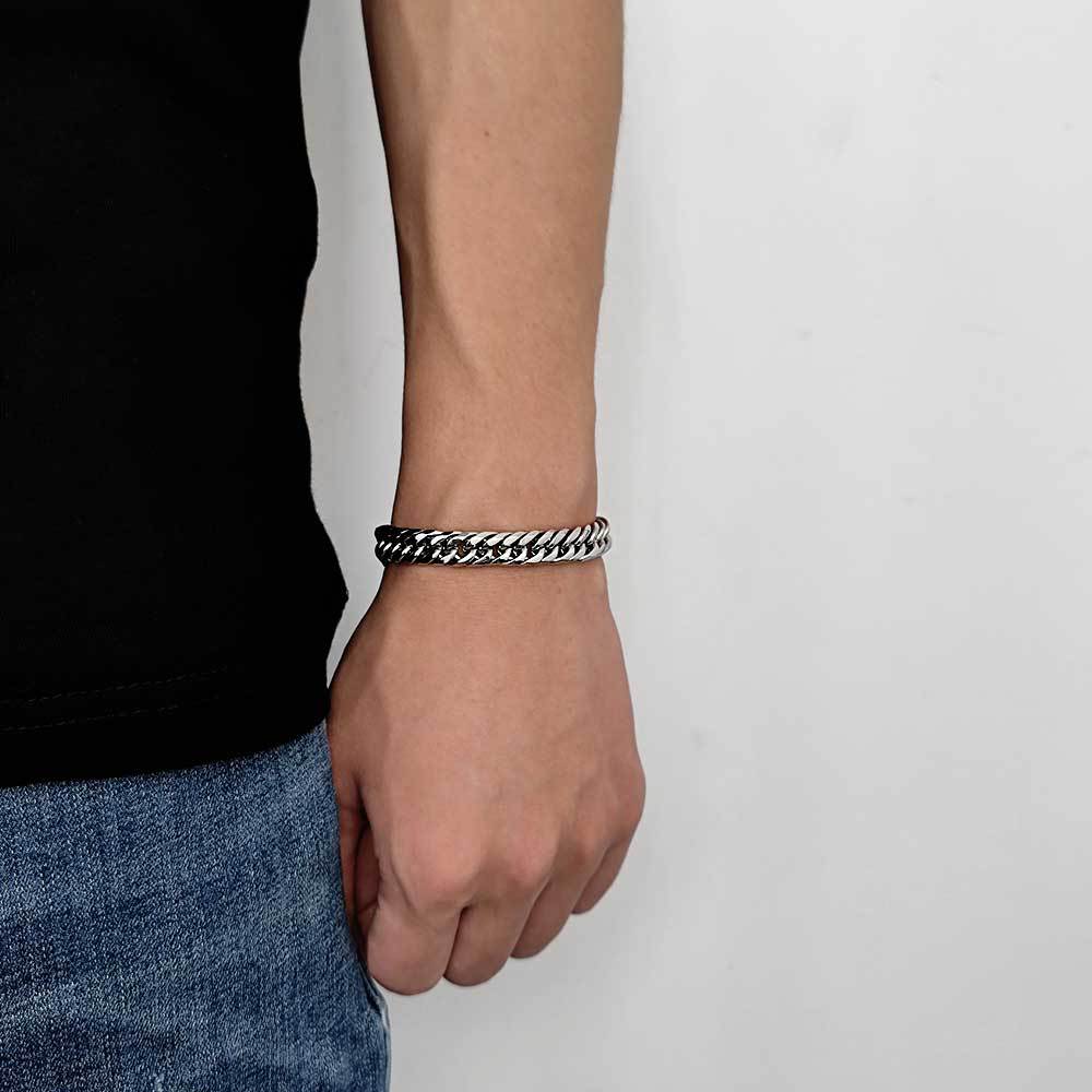 Command attention with this 7mm/9mm Double-Weave Stainless Steel Cuban Link Bracelet, a bold and masculine piece that blends luxury with urban attitude. Designed with a unique dragon-head clasp and six-sided polished finish, it delivers a powerful visual statement while maintaining refined craftsmanship and comfort.