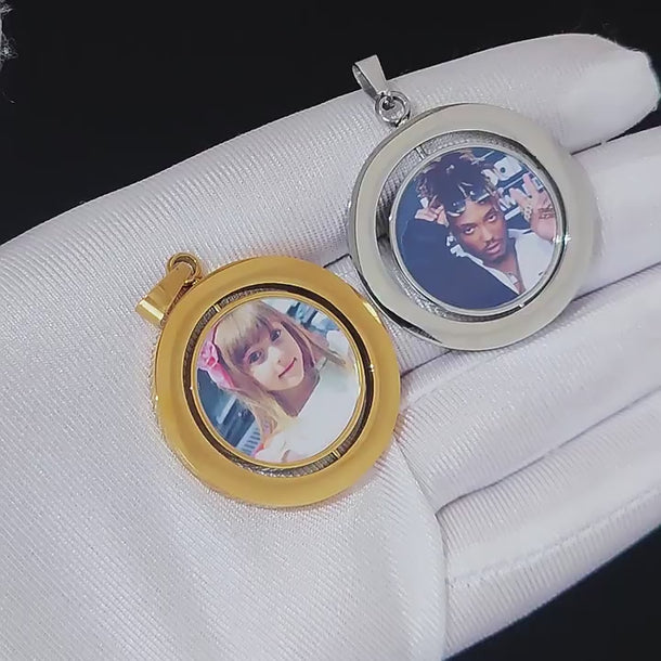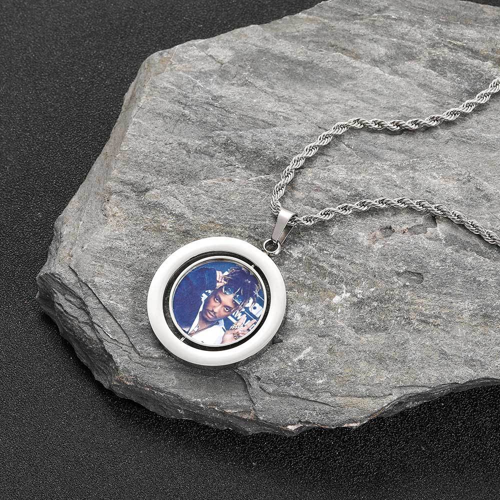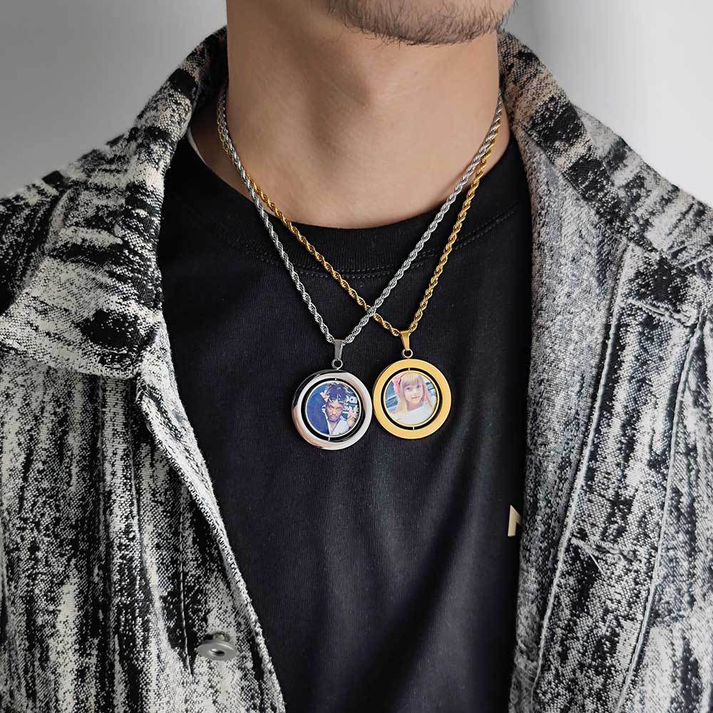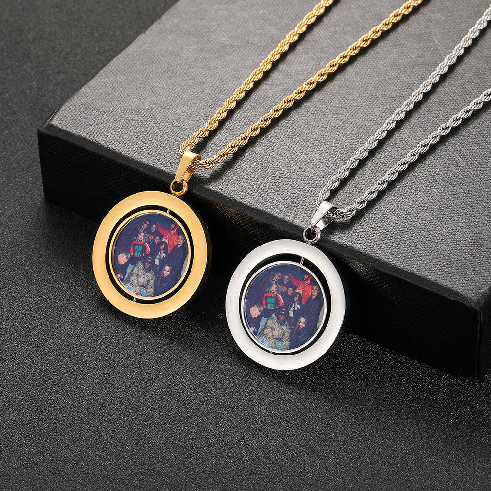 Wholesale Custom Photo Double-Sided Rotating Circular 304-Stainless Steel Hip Hop Pendant Necklace, Chain Length 24in, Waterproof