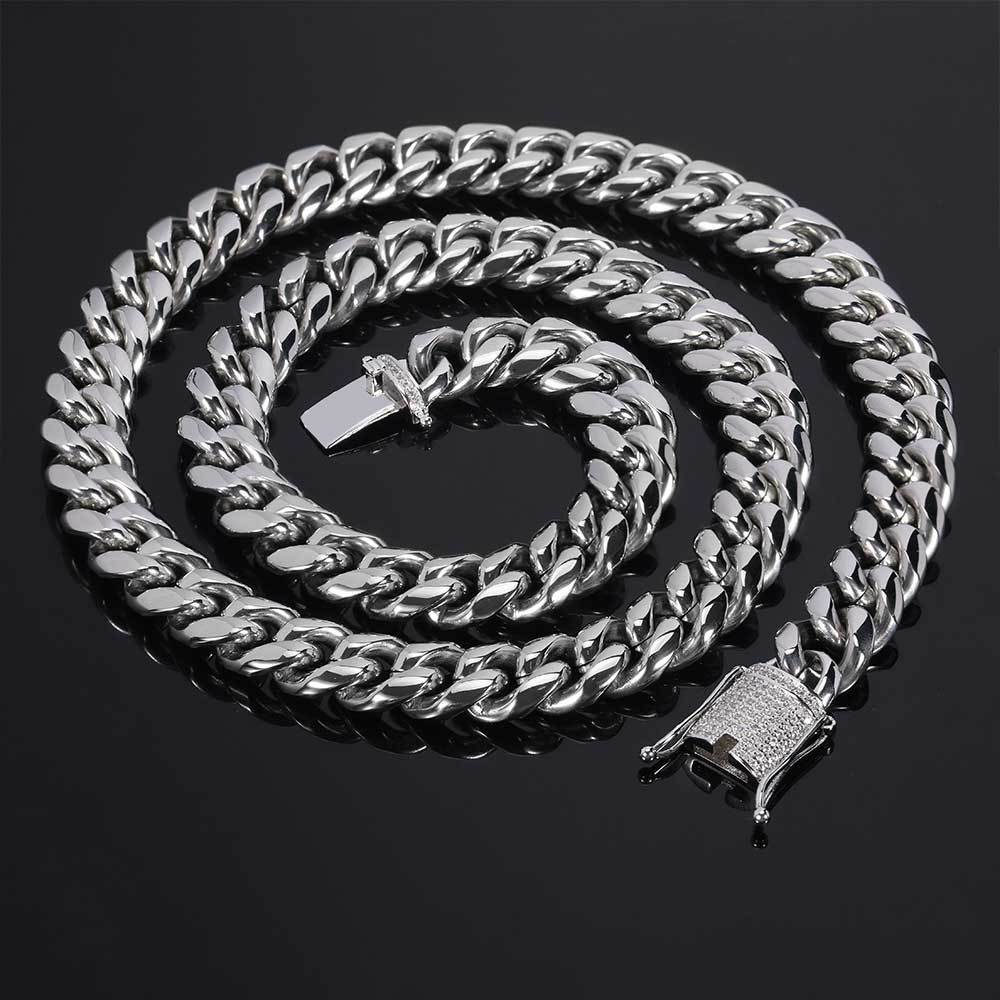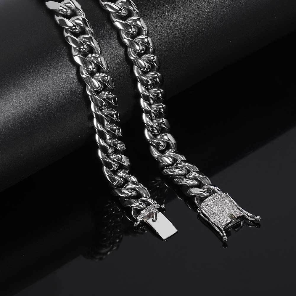 Wholesale Jewelry Set 12mm Iced Out Clasp Cuban Link Cubic Zirconia Hip Hop 304 Stainless Steel Chain Bracelet Necklace, Chain 16in-30in Silver / 12mm / 28in(71.12cm)