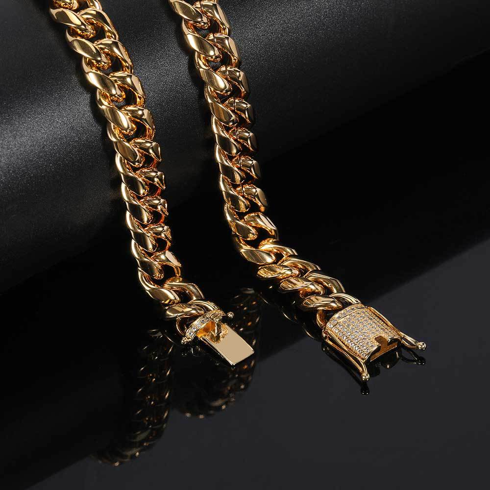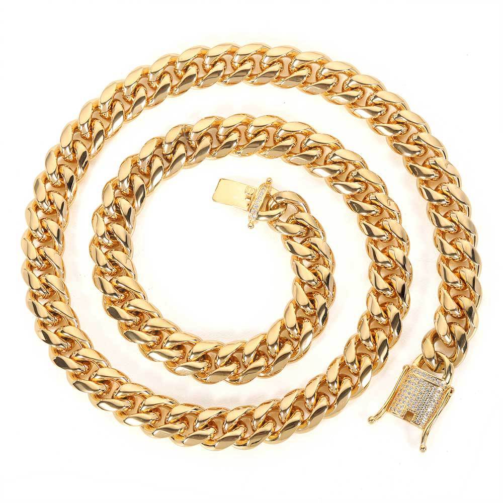 Wholesale Jewelry Set 12mm Iced Out Clasp Cuban Link Cubic Zirconia Hip Hop 304 Stainless Steel Chain Bracelet Necklace, Chain 16in-30in Gold / 12mm / 28in(71.12cm)