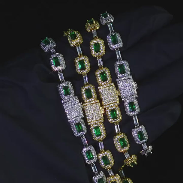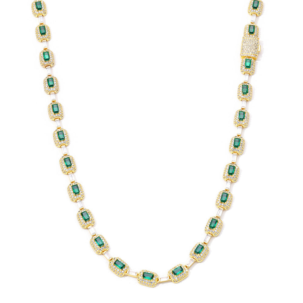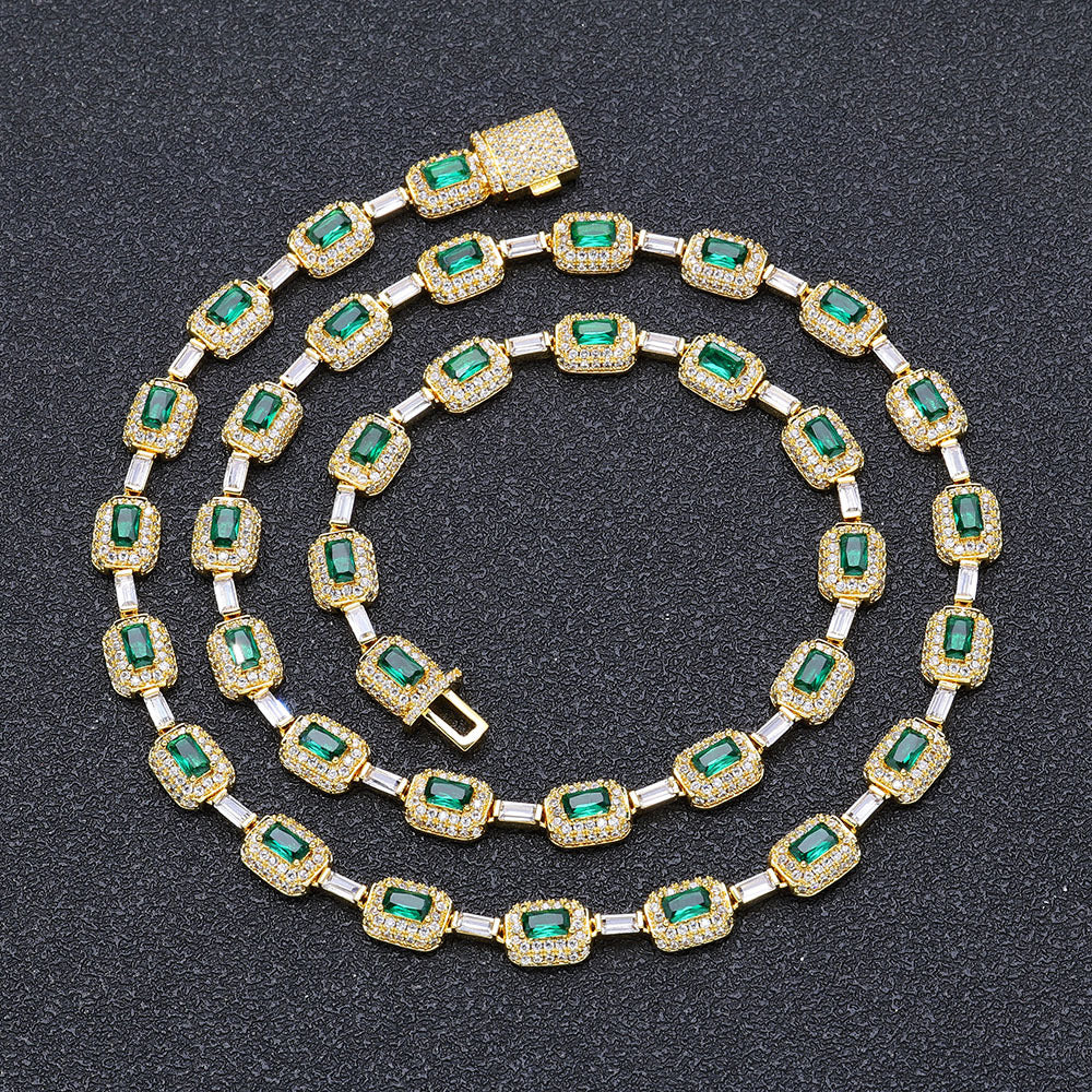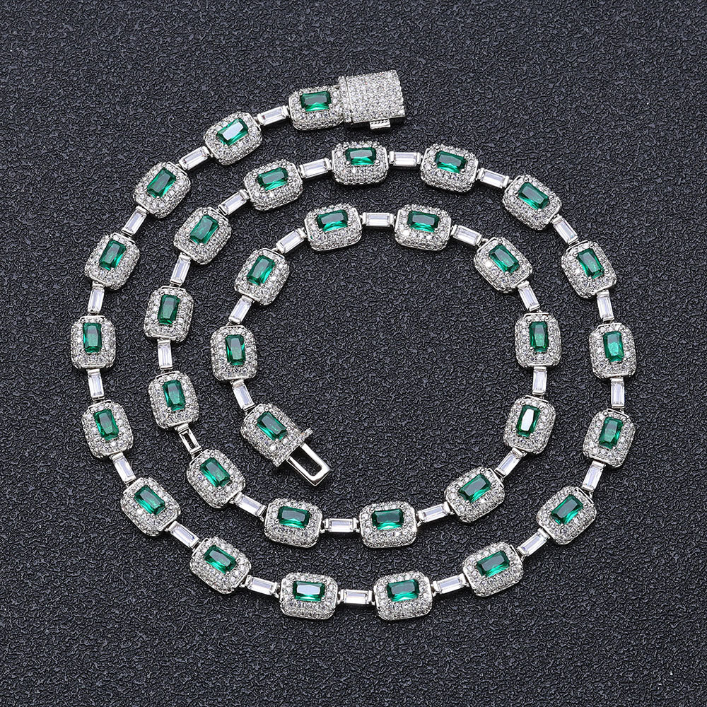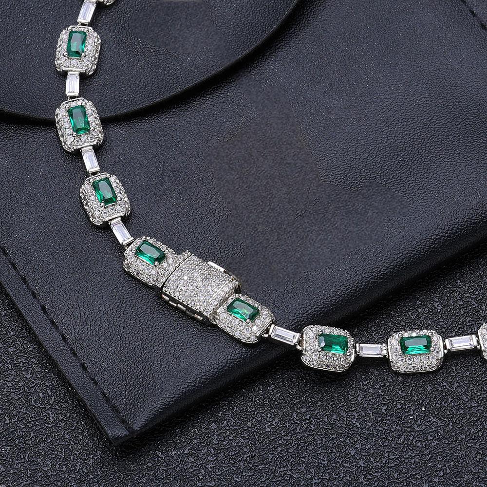 Wholesale Jewelry Set Emerald Green Gemstone Cubic Zirconia Hip Hop Bracelet and Necklace, Chain 7in-24in,Waterproof